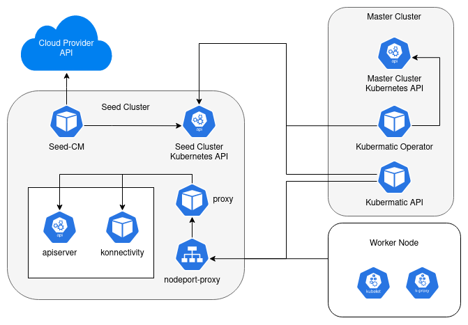 • KKP will create then a secure GRPC tunnel via Kubernetes Konnectivity proxy between worker and control plan, so no way back connection needs to be opened